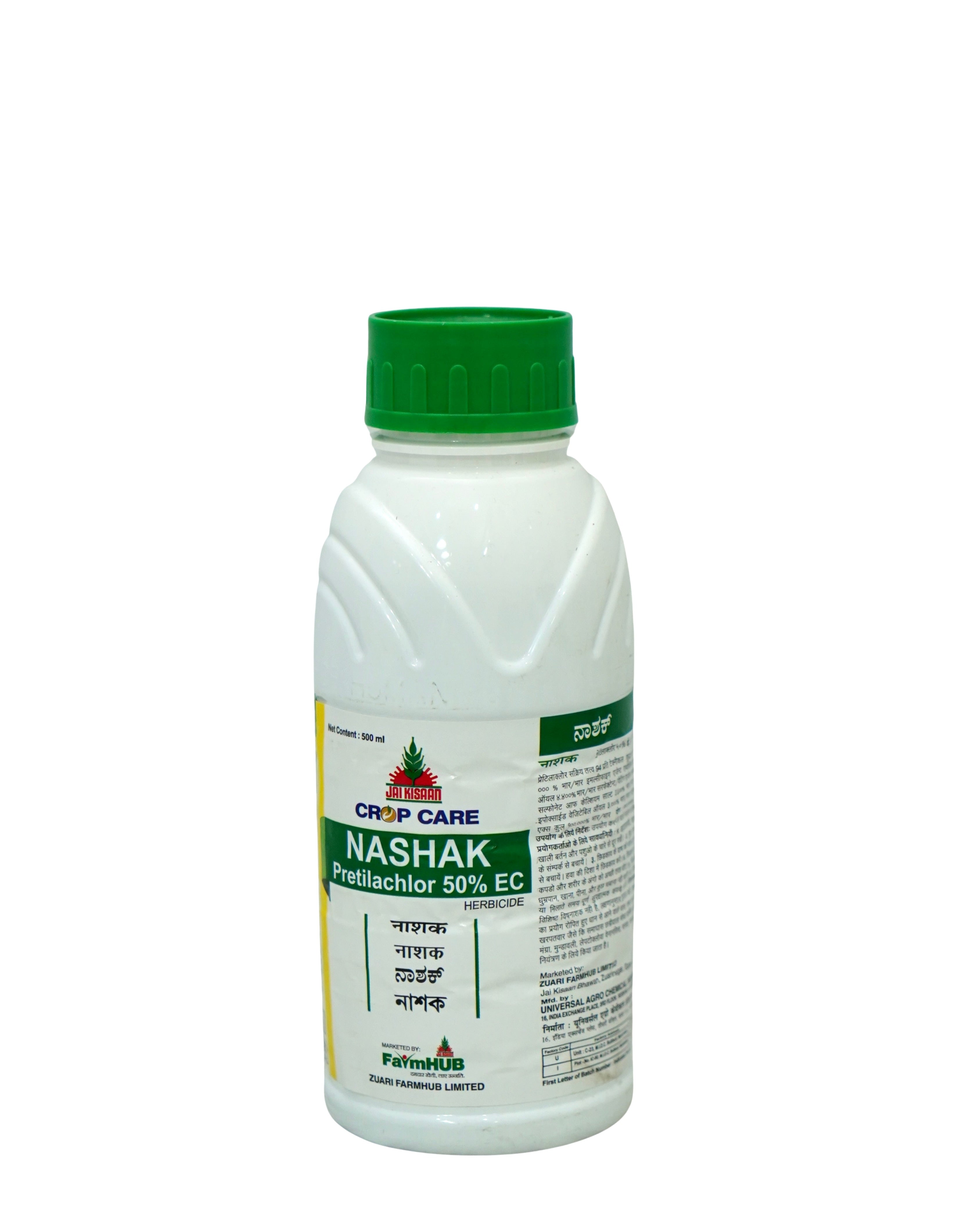 Jai Kisan Crop Care Nashak Pretilachlor 50% EC Herbicide 1L is a highly effective solution designed to control a wide range of annual grasses and broadleaf weeds in rice and other crops. Formulated with 50% Pretilachlor as the active ingredient, this herbicide works by inhibiting weed growth at the early stages, ensuring healthier crop development and improved yield. Its emulsifiable concentrate formulation allows for easy mixing and uniform application, offering expert-level weed management to protect your investment in the field.